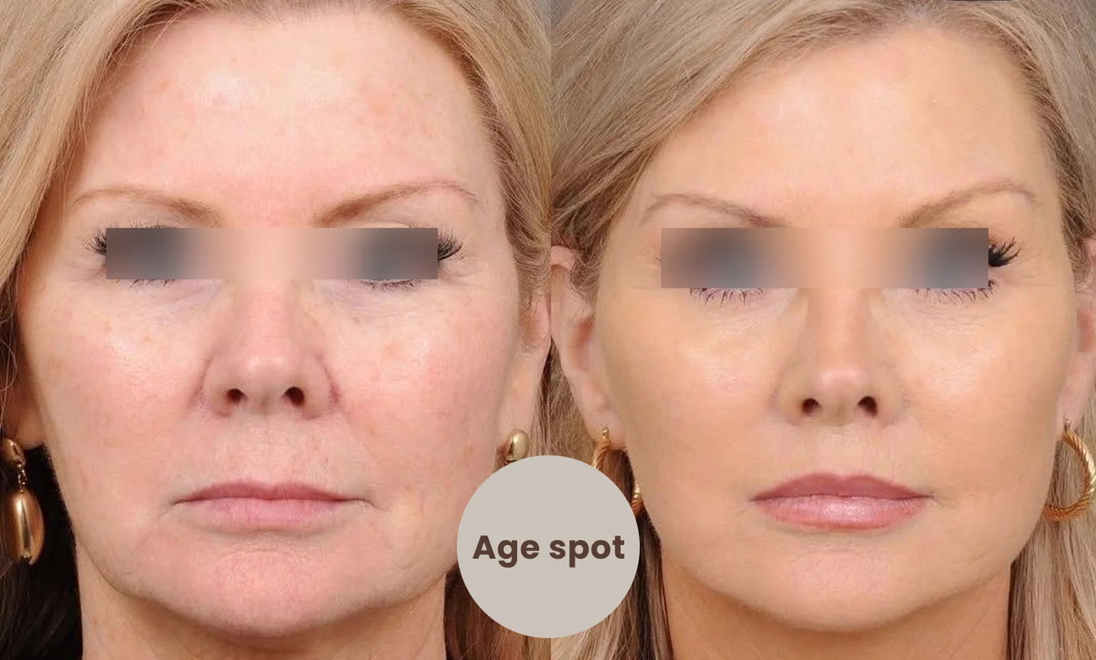 Treatments like laser resurfacing, PRP facials and pigment control skincare are effective methods for removing age spots and brightening skin.