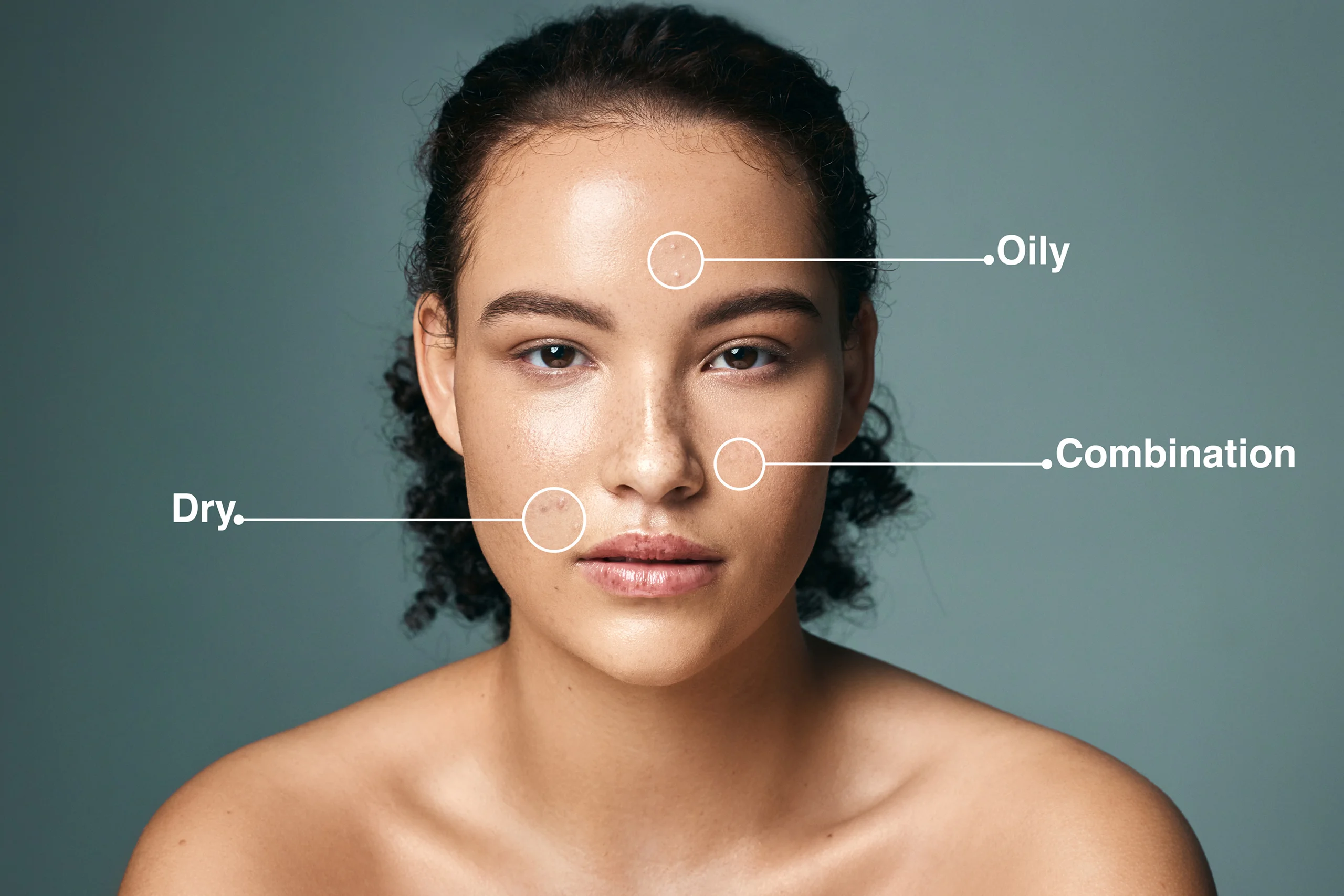 To identify combination skin, look for oily areas, typically on the forehead, nose and chin, with dry or normal skin on other parts of the face.